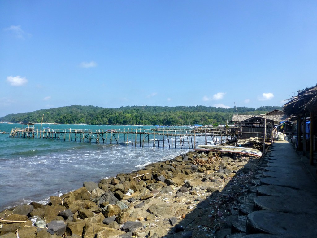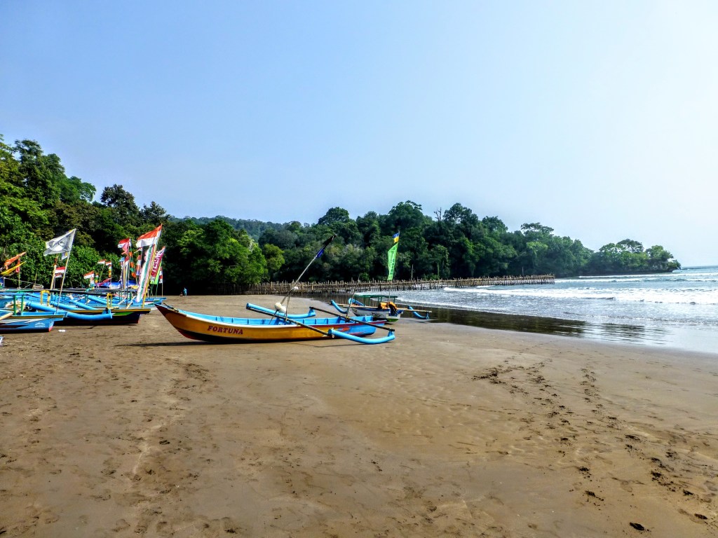 Pangandaran is a large fishing village based on a narrow isthmus (about 200m wide) with a national park at the end of the headland. On the west side there is a dark volcanic sandy beach, while on the east side there is a rocky sea wall keeping the sea out. Although the area is set up for tourism generally, it still feels relatively local compared to the well known beach resorts on Bali or other parts of Indonesia.