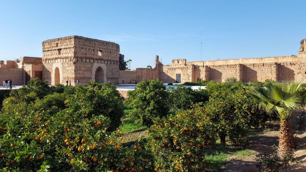 El Badi Palace, the most understated, yet most spacious and peaceful of the cultural collection, is a ruined palace built for the Sultan of the Saadian dynasty in the late 1500s. The main feature of the palace is its huge courtyard with a large pool at the centre bordered symmetrically by four sunken gardens, each containing orange trees bent double from the weight of their fruit.