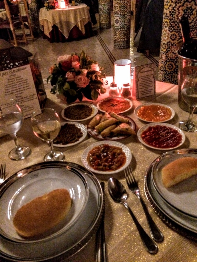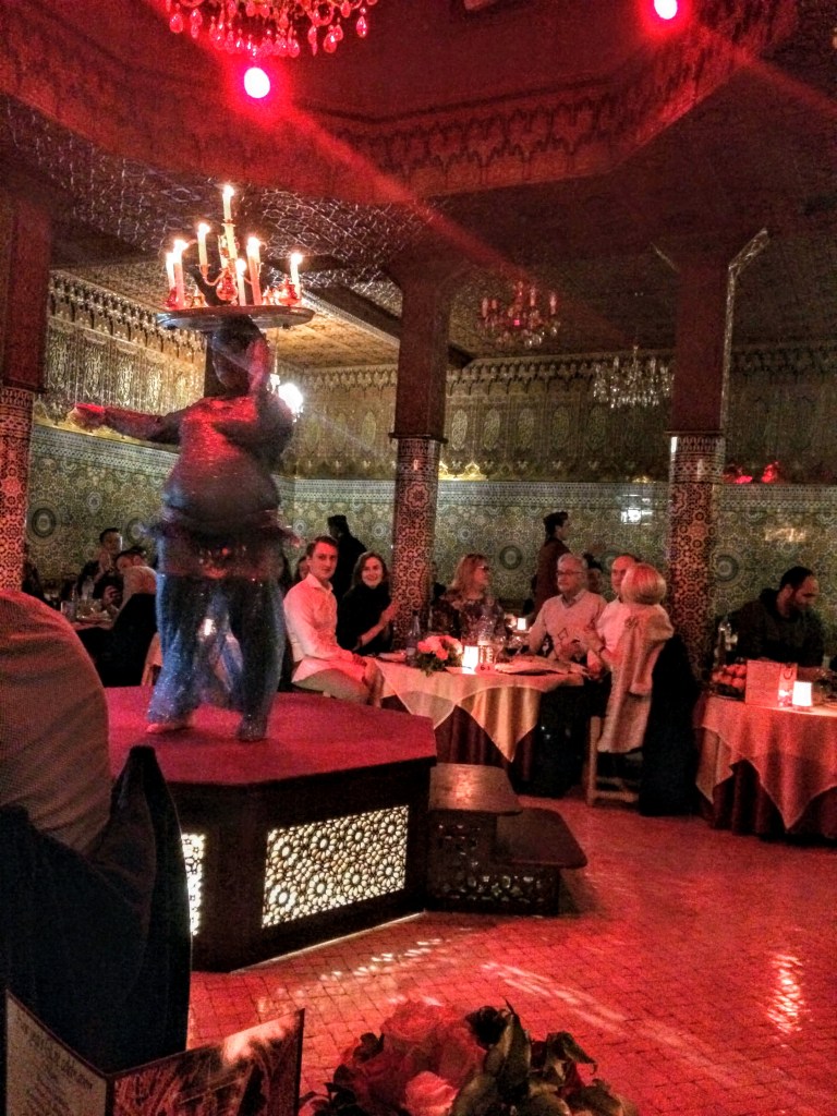 Our dinner started off with a bang – a set of six different Moroccan dips accompanied some fluffy bread and a large lady belly dancing furiously whilst balancing a tray of candles of her head. This was then followed by a very energetic man playing Moroccan hand cymbals in a fez hat with an extra long tassel that he managed to keep swirling around his head the entire act. There were two tagine courses accompanied by more acts – a pair of loose hipped belly dancers and lady dancing with candles on her head. Finally, we were serenaded as we ate our dessert by an entire band of men playing traditional flutes, trumpets, hand cymbals, drums, tambourines and maracas.